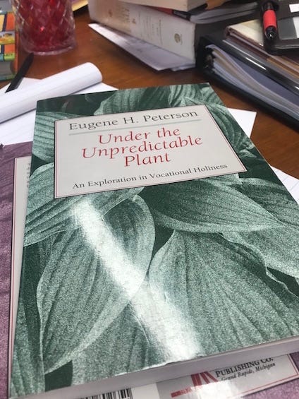Peterson offered a vision of pastoral ministry that was rooted in Scripture and story, seeped in the language of biblical theology and contemplation. It was a vision of pastoral ministry that assumed a calendar that was open to the Holy Spirit’s leading and a pastor’s study whose door was often closed so that its inhabitant could focus on the Word of God and prayer. It was and still is a beautiful vision.