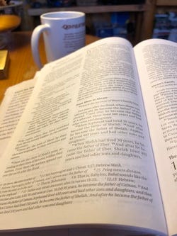 It’s early. I do my Bible reading first in my day, which means I’m often still shaking off last night’s dreams. My coffee’s on my left; our two sleepy dogs are on my right, and words are swimming in front of my eyes.